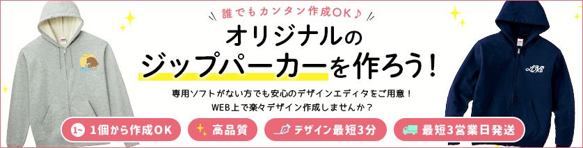 シャツのように前開きでフロントにファスナーがついているパーカー一覧です。オリジナルのジップアップパーカーを1個から業界最安値で作成できます。作成はエディタを使って簡単に、どなたでもセミオーダー感覚でデザイン作成・注文できます。ぜひ一度お試しください!